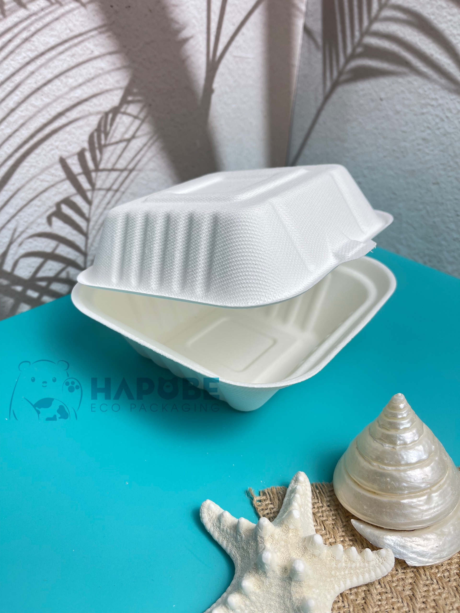 Hộp bã mía nắp liền, dạng vỏ sò. Loại 1 hoặc 2 ngăn. Bã mía là vật liệu 100% tự nhiên và phân hủy hoàn toàn. Là lựa chọn lí tưởng thay thế cho dạng hộp giấy phủ PE không thực sự thân thiện môi trường.