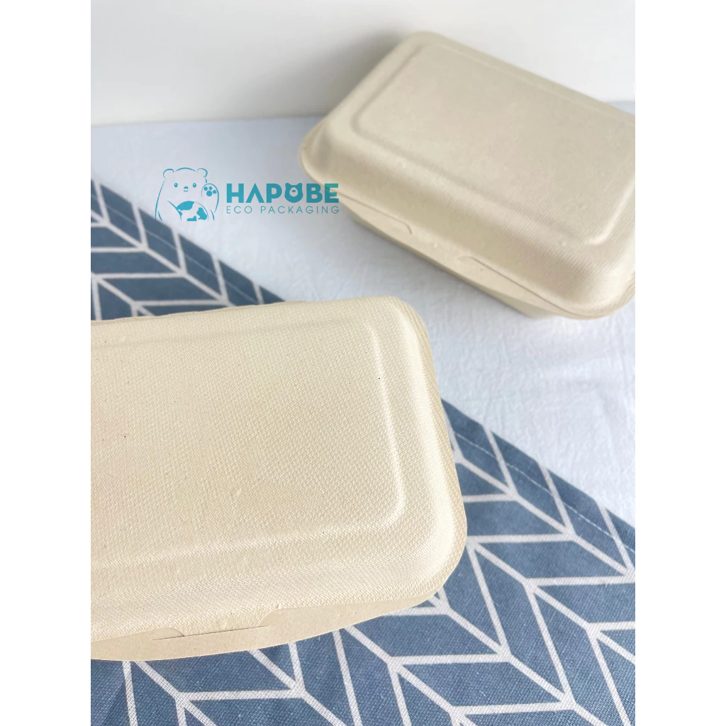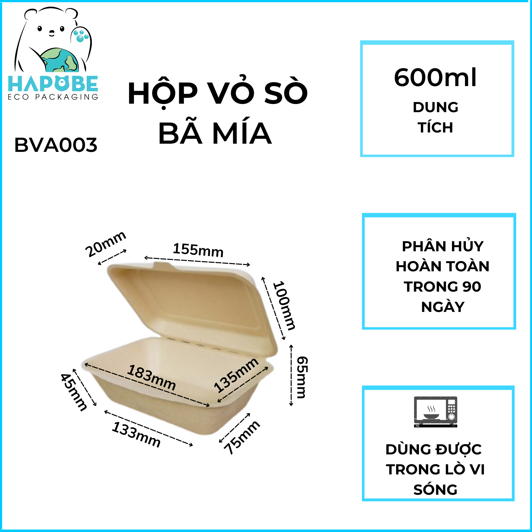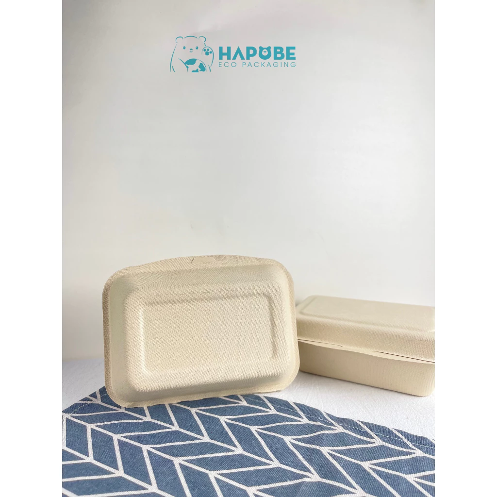 Hộp bã mía vỏ sò chữ nhật, hoàn toàn đảm bảo vệ sinh và an toàn tiếp xúc các loại thực phẩm. Quá trình sản xuất không sử dụng thêm bất kì loại keo hay phụ gia nào, ngoại trừ phụ gia chống thấm đạt tiêu chuẩn an toàn thực phẩm.