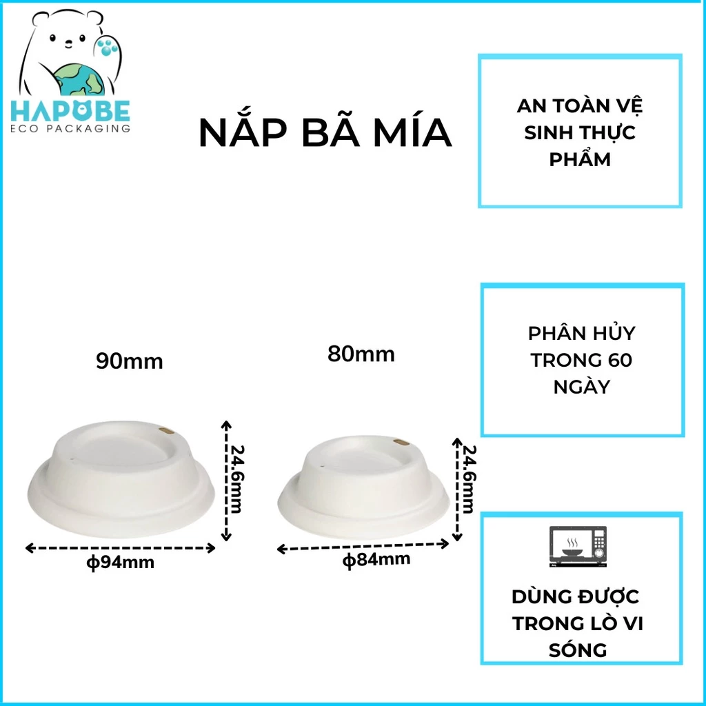 Nắp được làm từ bã mía, nguyên liệu tự nhiên có khả năng phân hủy sinh học. Sản phẩm này không chứa hóa chất độc hại, bảo vệ sức khỏe người tiêu dùng. Việc sử dụng nắp làm từ bã mía giúp giảm thiểu ô nhiễm từ rác thải nhựa, thể hiện cam kết của bạn với lối sống bền vững.